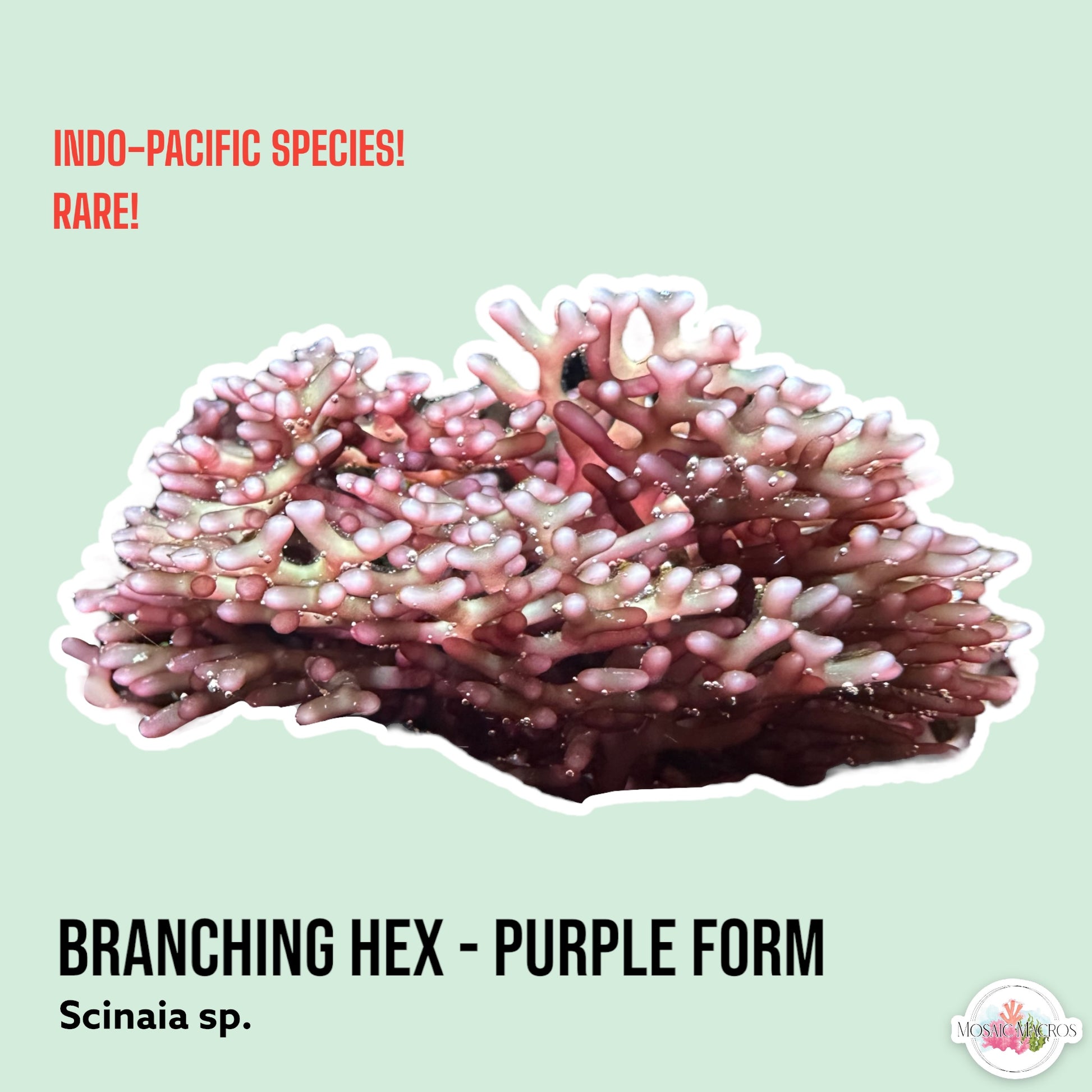 Scinaia sp. is an attractive red macroalgae that grows in a unique, rubbery branching pattern. Similar to regular Branching Hex, though this morph grows thicker branches with a pale reddish-purple coloration. The pale purple coloration comes from the type of lighting it is grown in, and can appear maroon/deep red in lower light (and during shipping.)
