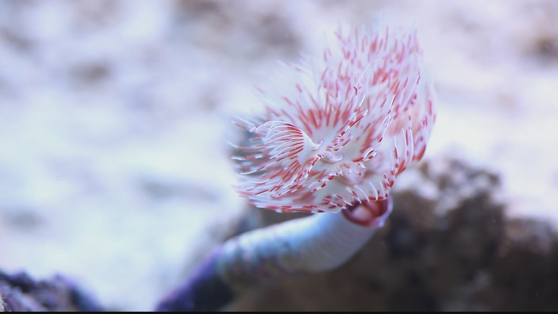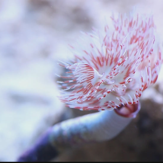 The Coco Feather Duster is a species of marine worm which lives within a hard tube-like structure made of calcium carbonate. The feather-like crown of the feather duster allows it to catch small prey items such as phytoplankton. These worms must be target fed phytoplankton or other filter-feeder foods for long term health. It may drop its crown when stressed.
