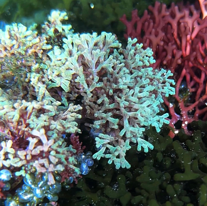 Laurencia iridescens is an attractive red macro algae that grows in a unique branching pattern. Under high lighting, this species sports a gorgeous light-blue iridescent shine along its branches.