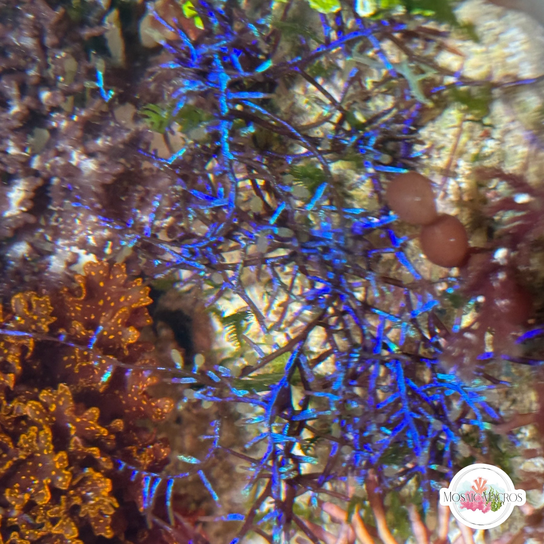 Coelothrix irregularis is a very small, attractive reddish-purple macroalgae with bluish-green iridescent tips that grows in a wire-like clump, similar to Chaetomorpha. This species sports a gorgeous, deep purple coloration under full-spectrum lighting and will develop the blue iridescence depending on how the algae is viewed.