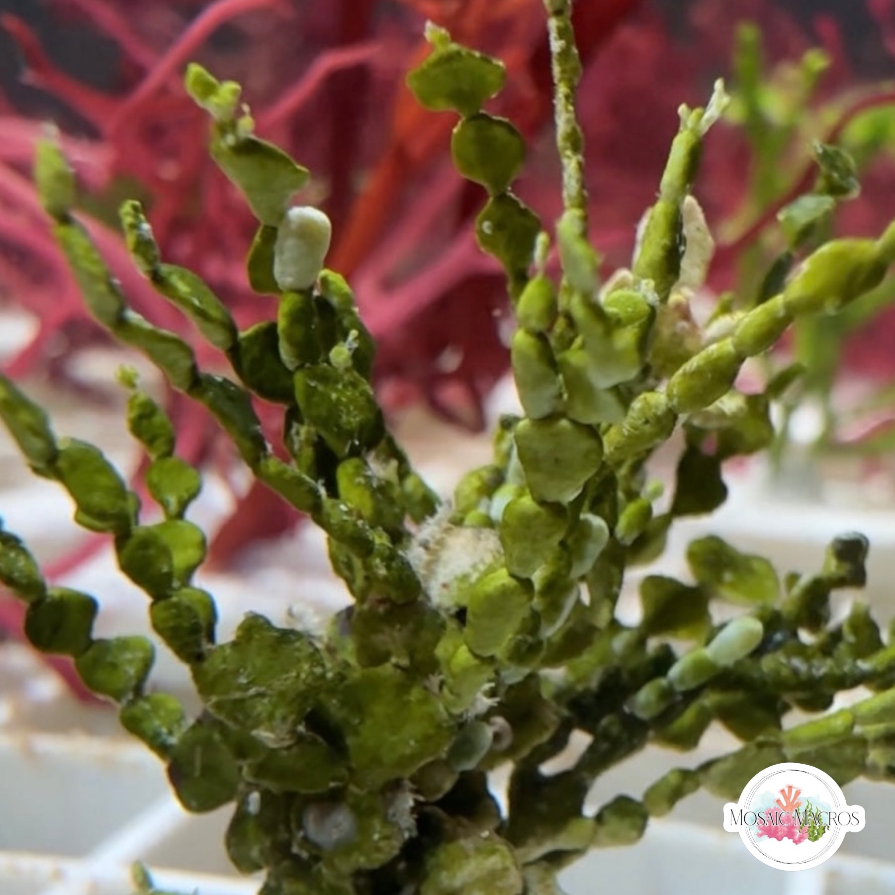 Halimeda tuna is a heavily calcified macroalgae that grows up out of substrate. This species is very unpalatable to most marine fish and invertebrates. This species is very, very small and only maxes out at about 2”.